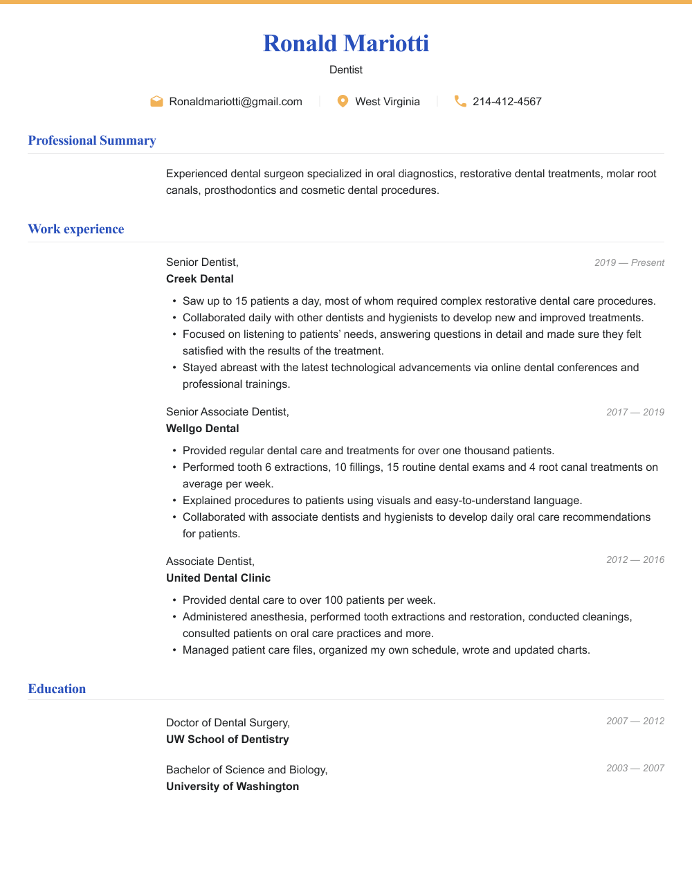 Let’s start by taking a look at a sample dentist resume to give you an idea of what information you may want to include. Next, we will go over each of the sections of the resume one by one with more tips on how to compose each one.